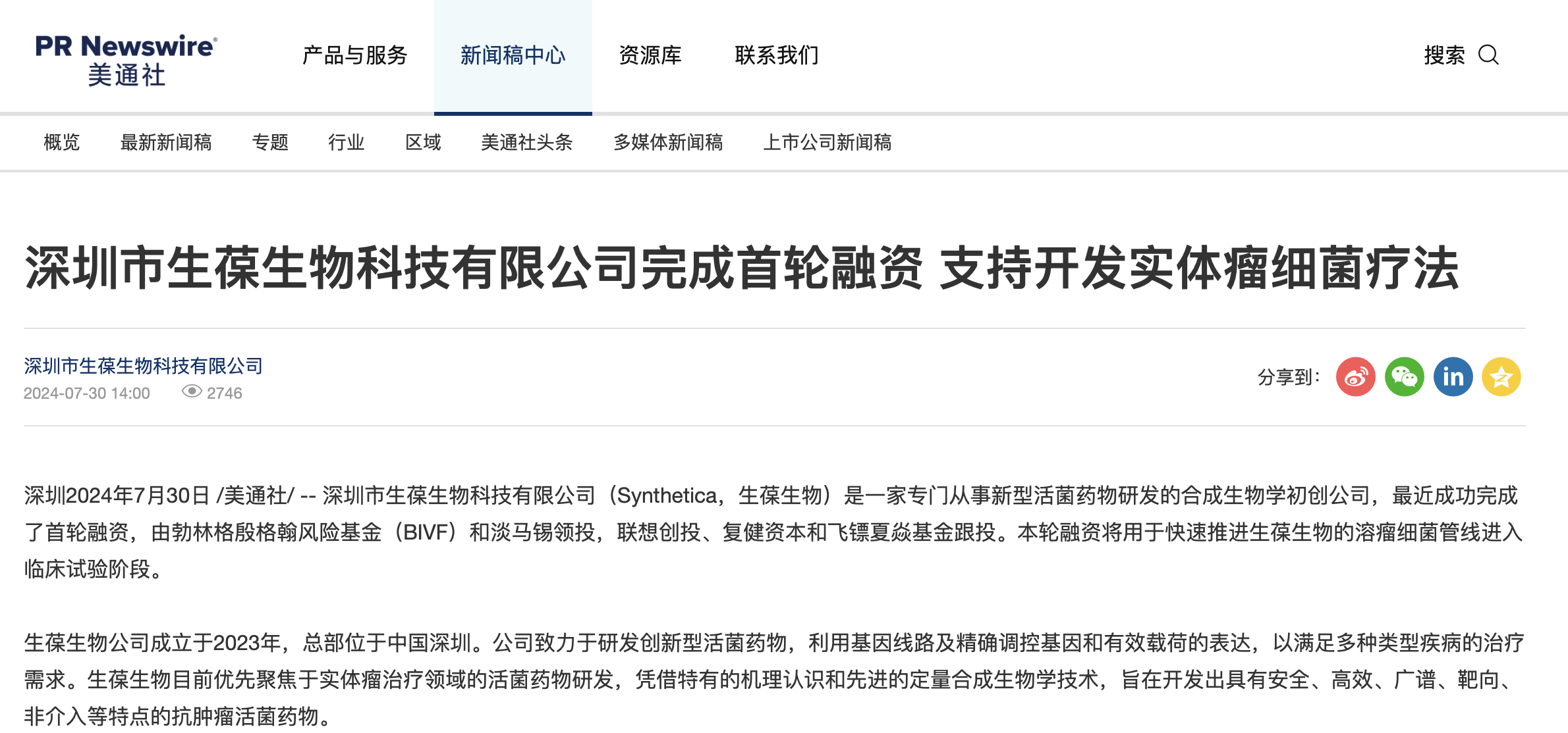 深圳市"专精特新"企业,全链路合成生物研发平台,微生物"酿造"天然药物,被权威机构评选为"全球最值得关注的50家合成生物学企业"之一完成A+轮融资,估值约10亿元。